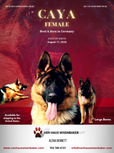1yo Bred, Born in Germany SV papers as primary, can be registered with AKC. She would have to be shipped from Germany. Shipping fee to one of major USA International airports is $3,000-$3,500