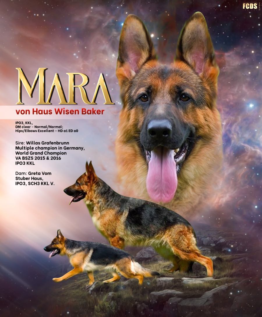Her father is famous Willas Grafenbrunn – multiple champion in Germany, World GrandChampion VA BSZS 2015 and 2016, his sister littermate (Mara’s Aunt) Walerry is VA BSZS – World GrandChampion 2014 and 2015